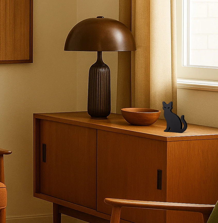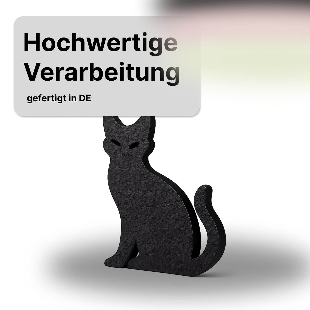Verleihen Sie Ihrem Zuhause einen Hauch von Eleganz mit unserem handgefertigten Katzen-Silhouette-Aufsteller. Dieses kunstvolle Dekorationsstück fängt die anmutige Form einer Katze in einer farbigen 2D-Silhouette ein, die durch eine Tiefe von ca. 1 cm eine dezente räumliche Wirkung erhält.