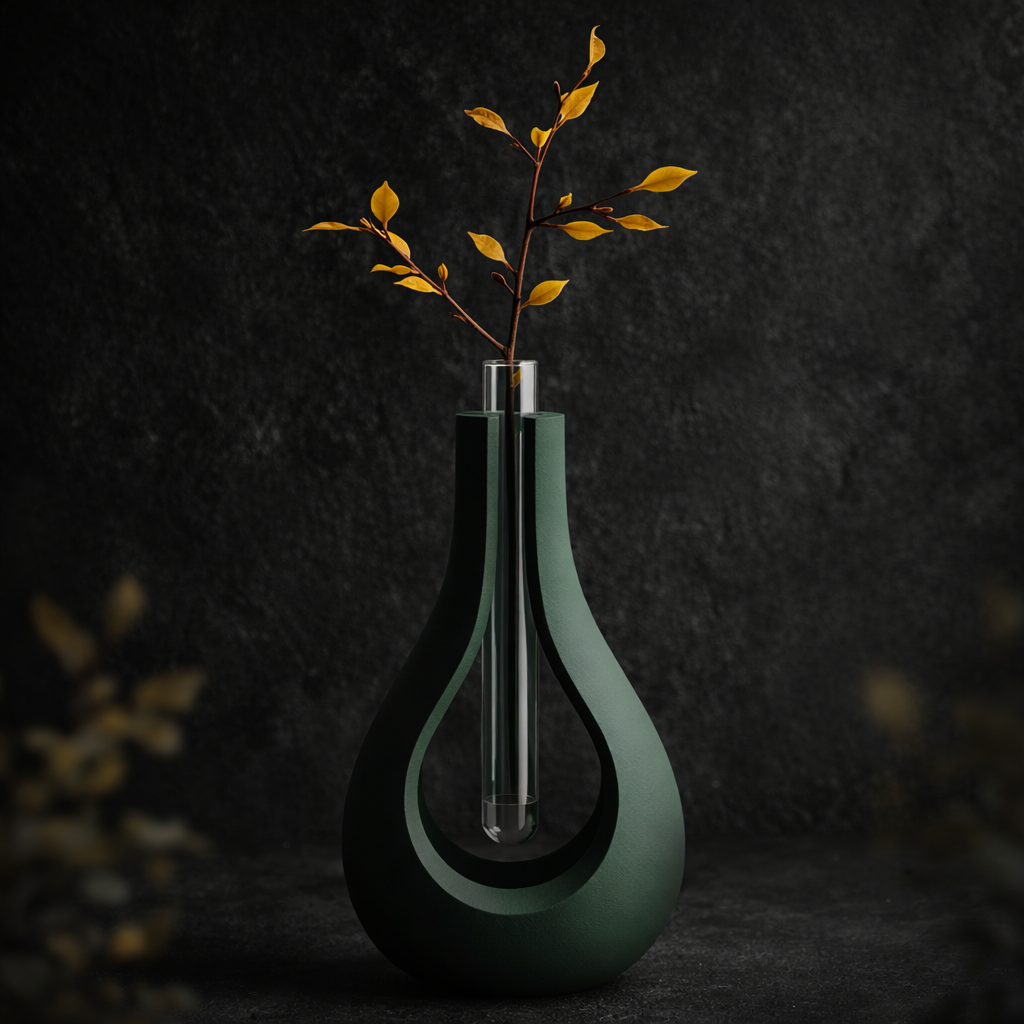 Diese moderne Glasvase setzt einzelne Blumen, Zweige oder Trockenblumen stilvoll in Szene. Das filigrane Gestell umschließt ein zentrales Glasröhrchen, das scheinbar frei im Raum schwebt 🌿 – ein echter Blickfang für jedes Zuhause.